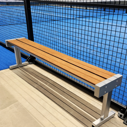 Bank zonder rug met een lengte van 1,80m. Ideaal voor bij de padelbaan. De bank heeft een grijze kunststof zitting. De zitting is gemaakt van gerec...